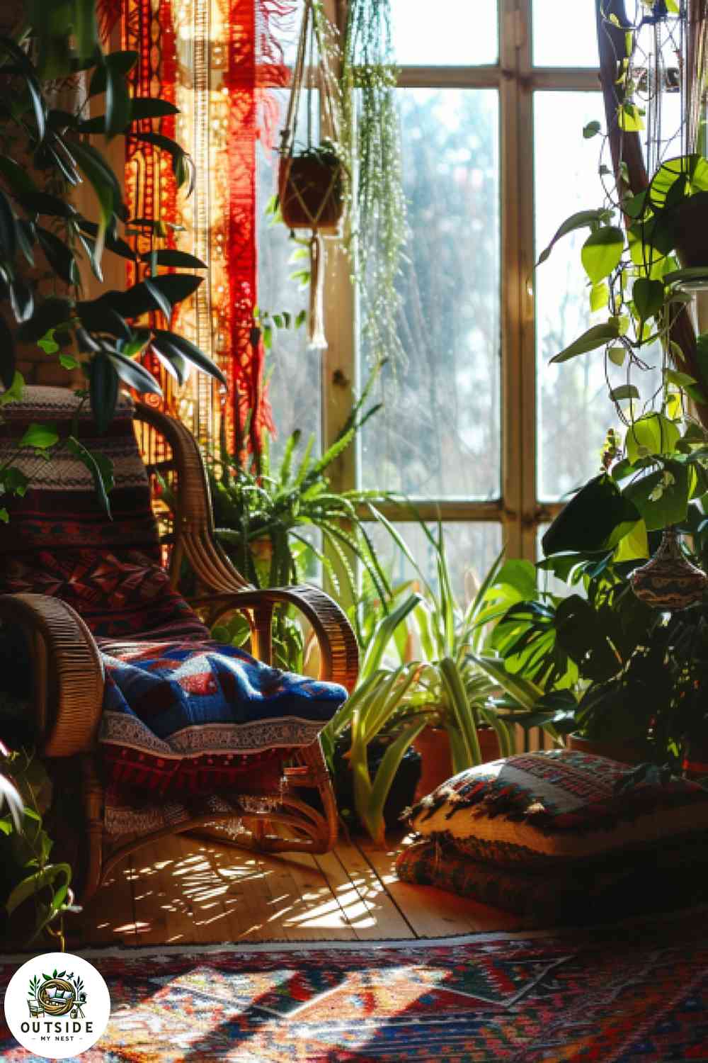 Embrace bohemian chic with vibrant patterns and colorful textiles against your patio wall. Bamboo furniture and hanging plants enhance the laid-back, eclectic vibe. It’s a cozy corner for every sunset.