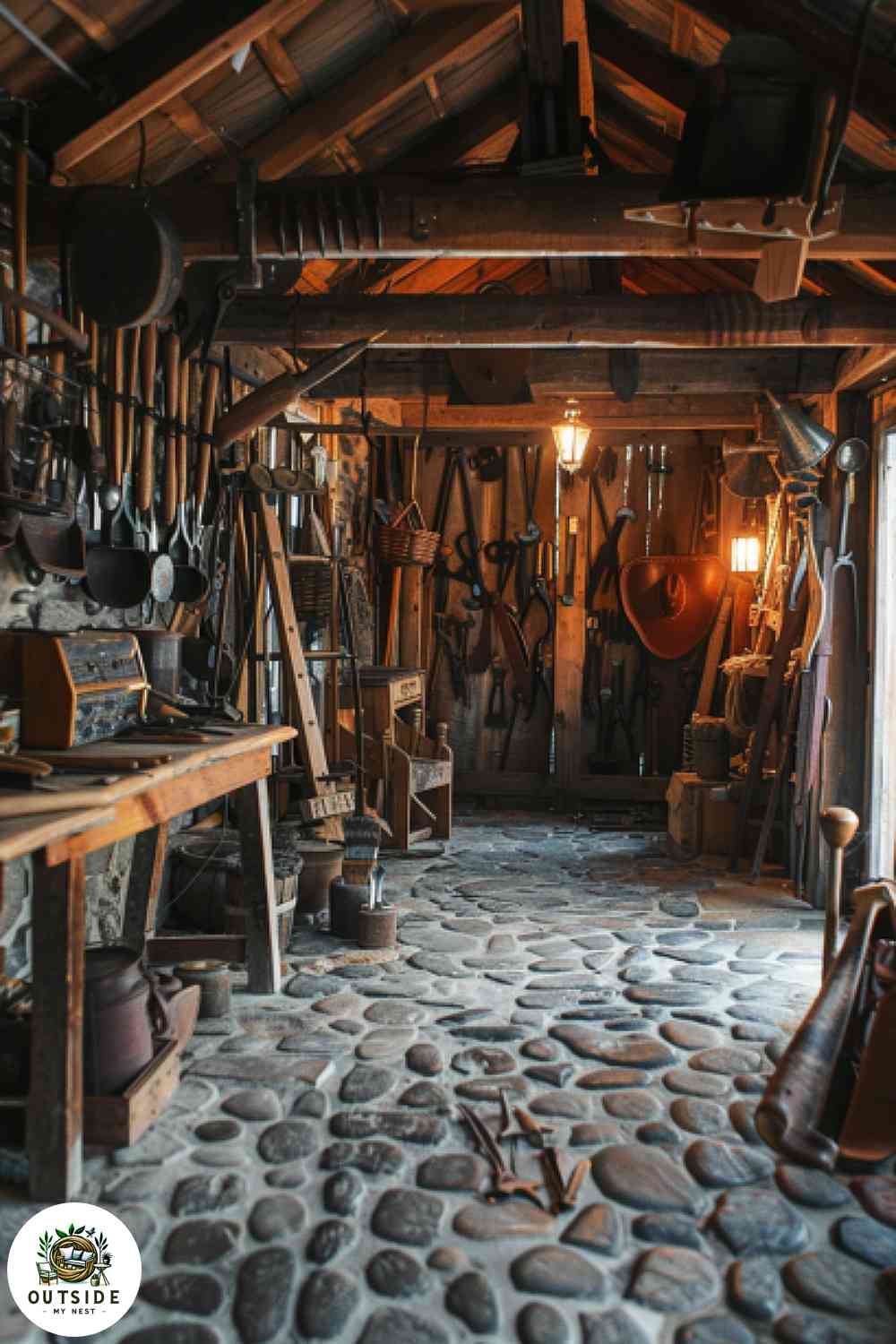 Imagine stepping into a shed where history meets functionality. Exposed wooden beams give it an old-world charm, while walls adorned with vintage tools remind you of a bygone era. Perfect for those who appreciate the beauty in tools.
