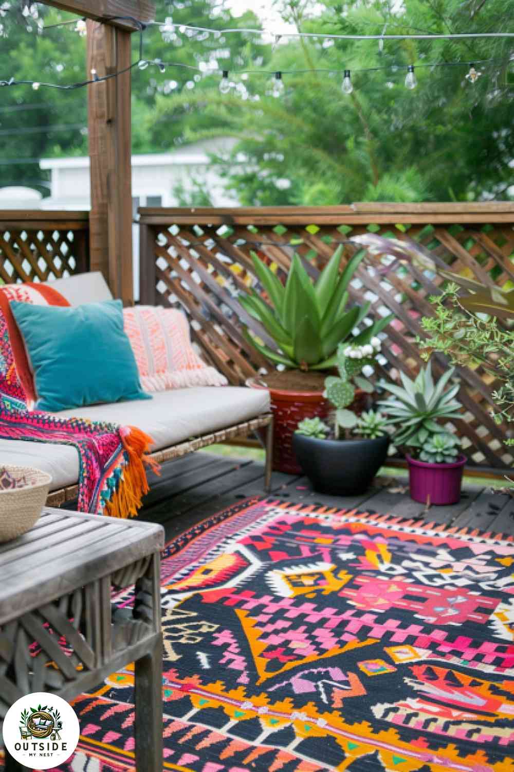 Add a dash of charm with a colorful outdoor rug. It not only defines your seating area but also adds warmth and texture underfoot.