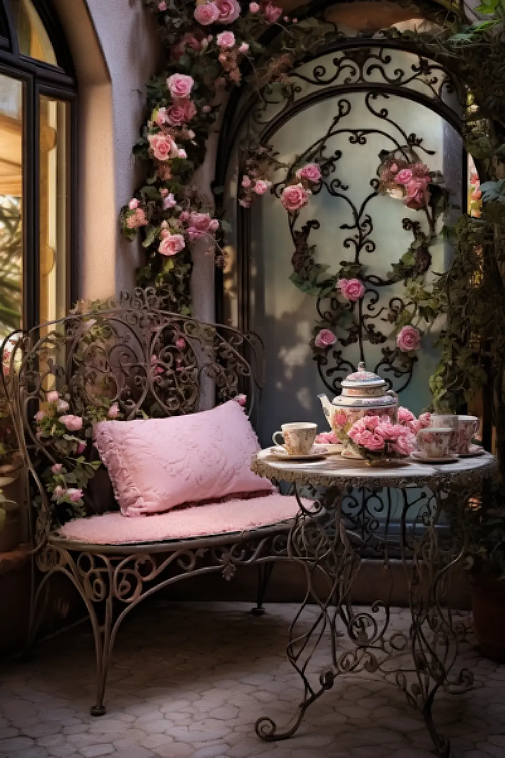 Infuse your patio with the elegance of a Victorian garden using ornate wrought-iron furniture and climbing roses to create a charming nook. A delicate lace cushion on the bench adds a touch of softness, while a matching table set with fine china suggests a ready-for-tea ambience. The intricate metalwork and surrounding florals offer a timeless aesthetic that can be replicated for a tranquil garden escape.