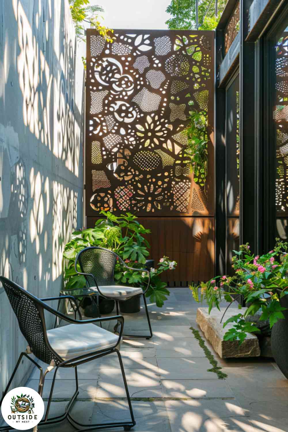 Decorative metal panels on a small patio with intricate designs and modern seating.
